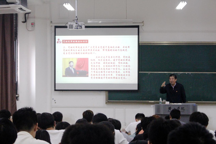 校纪委书记陈家祥首先向同学们讲解了党的纪律的概念和特征,在讲解的过程中将党的纪律与习近平总书记重要讲话精神相结合,娓娓道来,使同学们切实感觉到党的纪律不仅一种理论,更是在客观行为规范的基础上形成和发展起来的。随后,校纪委书记还指出党的纪律是维护党的团结统一的有力武器,是保持党的先进性和纯洁性的重要条件,是党的路线、方针、政策得以实现的重要保证,对于增强党的凝聚力和战斗力,密切党与人民群众的血肉联系具有十分重要的作用。