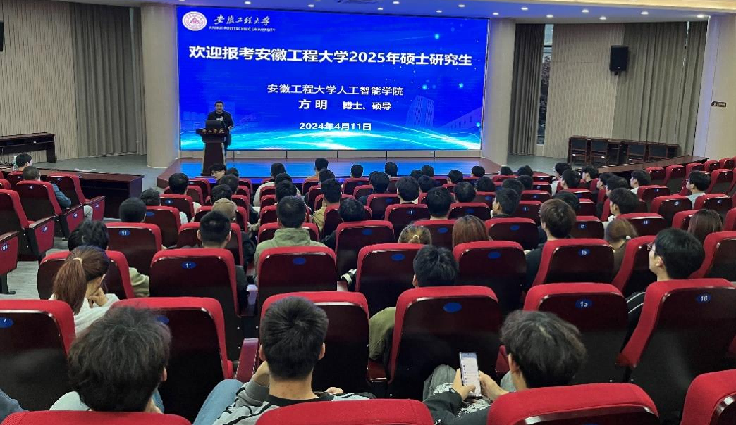 本次会议分两个阶段。第一阶段由江本赤教授和方明博士为我院学生介绍安徽工程大学人工智能学院的研究生招生情况,方明博士从学校学院简介、2024年招生录取情况、2025年招生计划情况、学科特色研究方向和研究生奖助体系等五个方面进行了宣讲,江本赤教授对人工智能学院的研究生报考情况进行了补充说明,并与学生进行了现场交流。