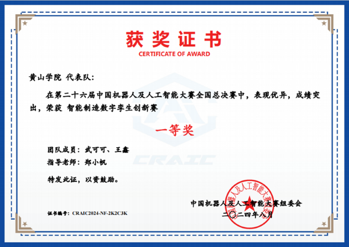 8月19日至23日,第二十六届中国机器人及人工智能大赛全国总决赛在线上举行。必赢3003no1线路检测中心、信息工程学院共5只队伍代表必赢官网参赛并成功晋级智能制造数字孪生创新赛、机器人舞蹈赛(仿人多人)、机器人竞技赛(iLoboke足球)三个赛道全国总决赛。必赢3003no1线路检测中心武可可、王鑫同学荣获全国总决赛一等奖1项,其余队伍获得全国总决赛二等奖2项、三等奖1项、优秀奖1项。