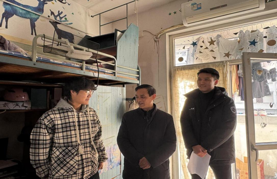 12月31日上午,必赢3003no1线路检测中心党委副书记汪双安在辅导员陪同下,深入学生宿舍,开展宿舍安全卫生检查并与学生亲切交流。
