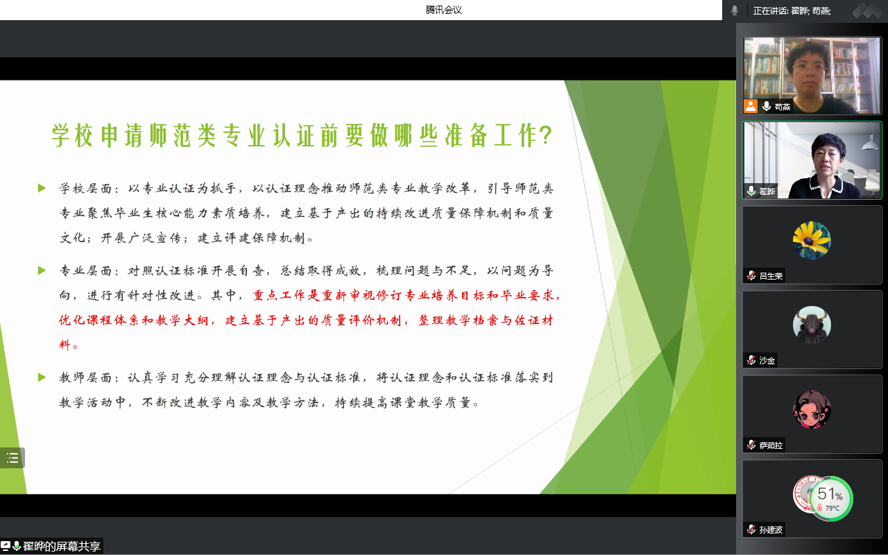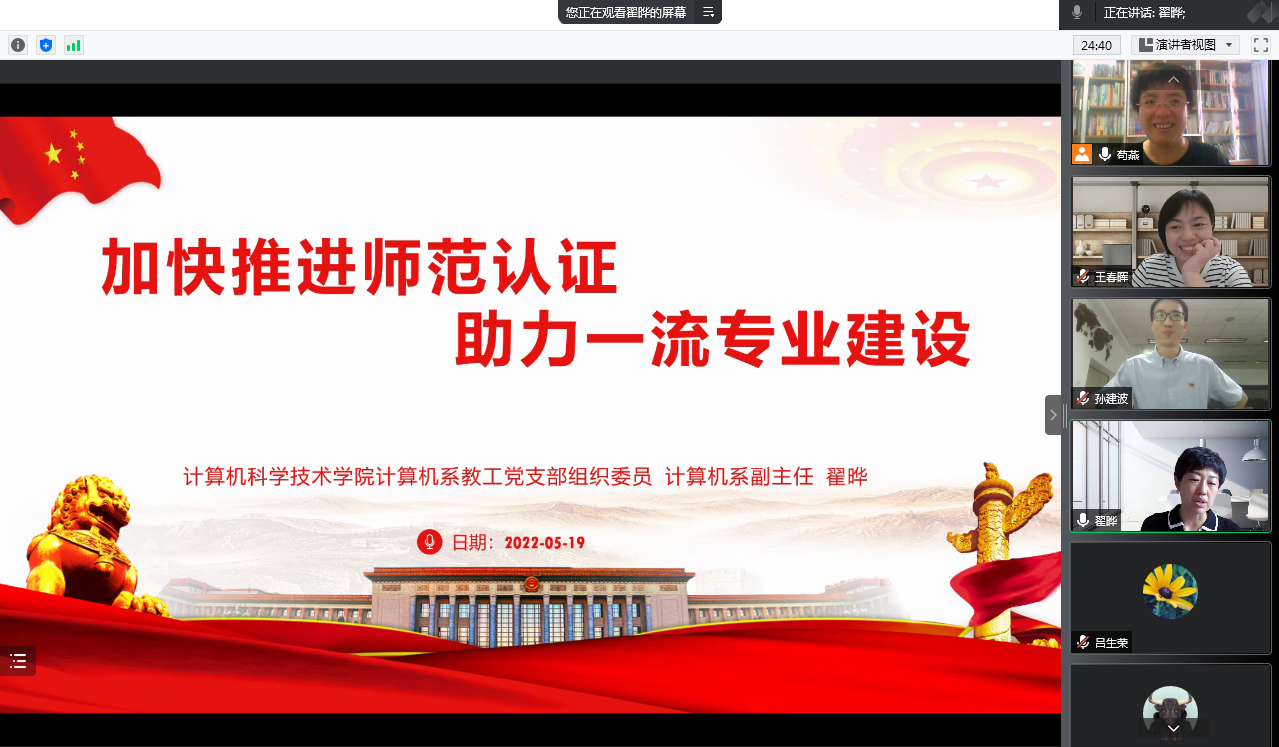 会上,计算机系党支部组织委员、计算机系副主任翟晔围绕Beat365师范认证工作了详细汇报。首先回顾了Beat365师范认证的前期准备工作、汇报了目前Beat365师范认证的进展情况并介绍了下一步的工作计划,最后强调了师范认证作为Beat365今年的头等要务,需要每一位老师的鼎力支持和全力配合。汇报之后,老师们和系主任围绕师范认证的重要性和目前存在的困难进行了激烈的讨论和交流,大家纷纷表示愿意为了攻克师范认证这个重任贡献自己的一份力量。