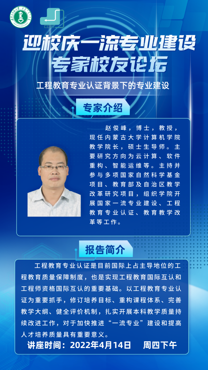 作为“迎校庆一流专业建设专家校友论坛”系列活动内容之一,4月14日,Beat365官方网站邀请2000届优秀毕业生赵俊峰校友为全院教职工开展了专业建设专题讲座。赵俊峰教授现任内蒙古大学计算机学院教学院长、硕士生导师。本次讲座采用线上会议的形式展开,由院长林民教授主持,报告主题为“工程教育专业认证背景下的专业建设”。