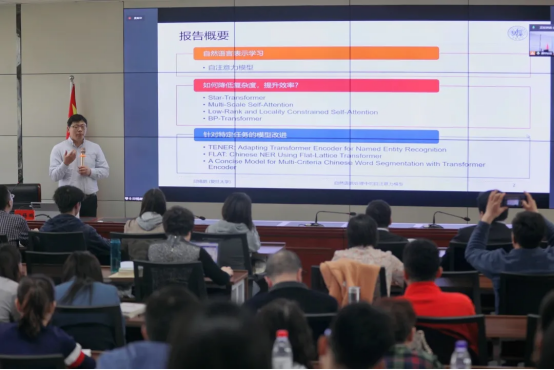 本次讲座特邀复旦大学计算机学院邱锡鹏教授做题为《自然语言处理中的自注意力模型》的学术报告,邱锡鹏教授首先对自然语言处理的表示以及常用的模型进行了介绍,然后介绍自注意力模型的原理,并分析自注意力模型的基本原理和优缺点,提出一些改进模型(Star-Transformer、Multi-Scale Transformer、BP-Transformer等),随后介绍了自注意力模型在文本分类、实体名识别等任务上的具体应用并对自注意力模型及其未来发展趋势进行展望。最后,邱锡鹏教授与Beat365师生开展学术交流。
