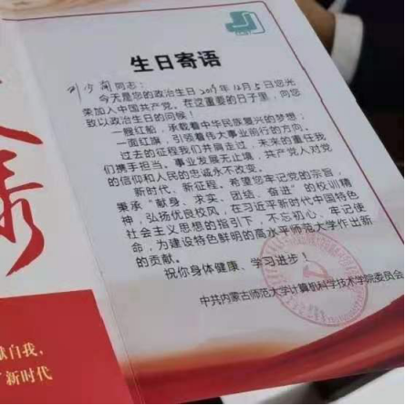 计算机系学生党支部书记伟丽斯同志向陆静芳、高颖杰、张雅雯、谈家璐、宫雨诗、李娜、吴梦阳、娜何雅8位同志赠送政治生日贺卡。