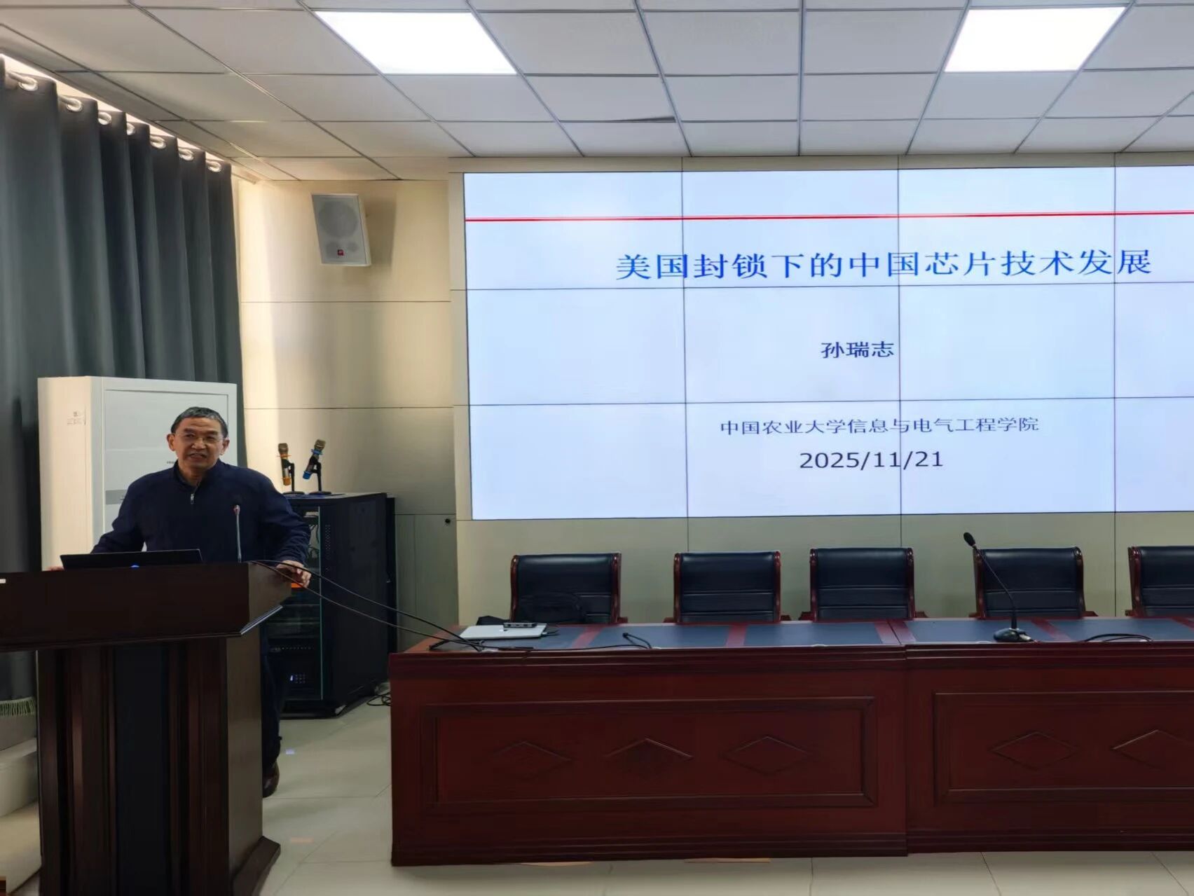 11月21日,Beat365官方网站“智算·师韵北疆”系列讲座第六期在大数据楼114室成功举行。讲座特邀中国农业大学信息与电气工程学院教授,博士研究生导师,Beat365官方网站银龄教授孙瑞志担任主讲嘉宾,围绕“美国技术封锁背景下中国芯片产业的自主创新路径”展开深入分享,2025级硕士研究生参加活动。活动由学院副院长斯琴图主持。